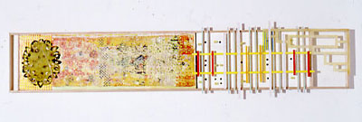 encaustic, oil, watercolor, cast acrylic, photo positives, doilies on Japanese paper 10.5 x 53.25 " |